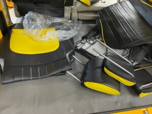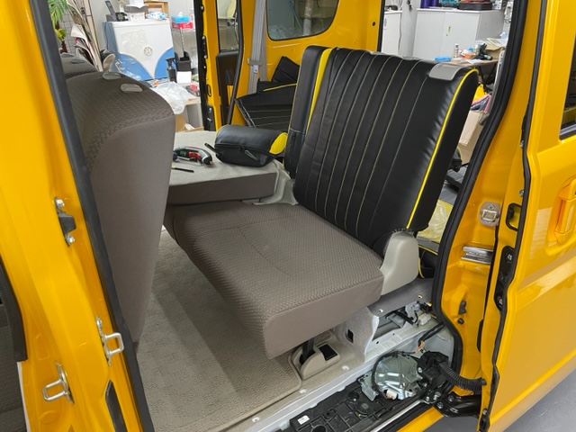 内装パーツのペイント&組付けも完了してシートカバー関係の取付に入りました。